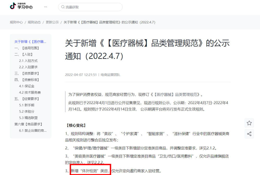 4月7日,抖音电商发布了关于新增《【医疗器械】品类管理规范》的公示通知,公示期为2022年4月7日-14日。没错,抖音也开始卖医疗器械了!